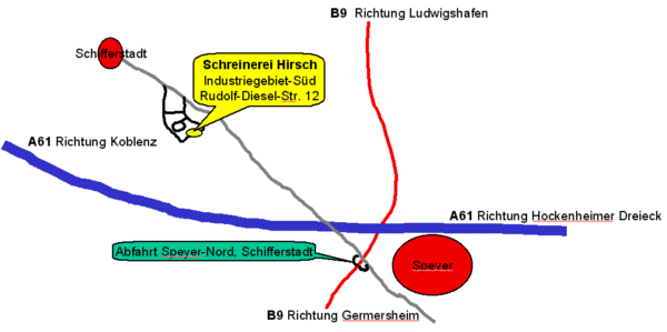 Sie erreichen uns über die A61 und B9 in Richtung Speyer/Schifferstadt. Nehmen Sie die Abfahrt Speyer-Nord/Schifferstadt.